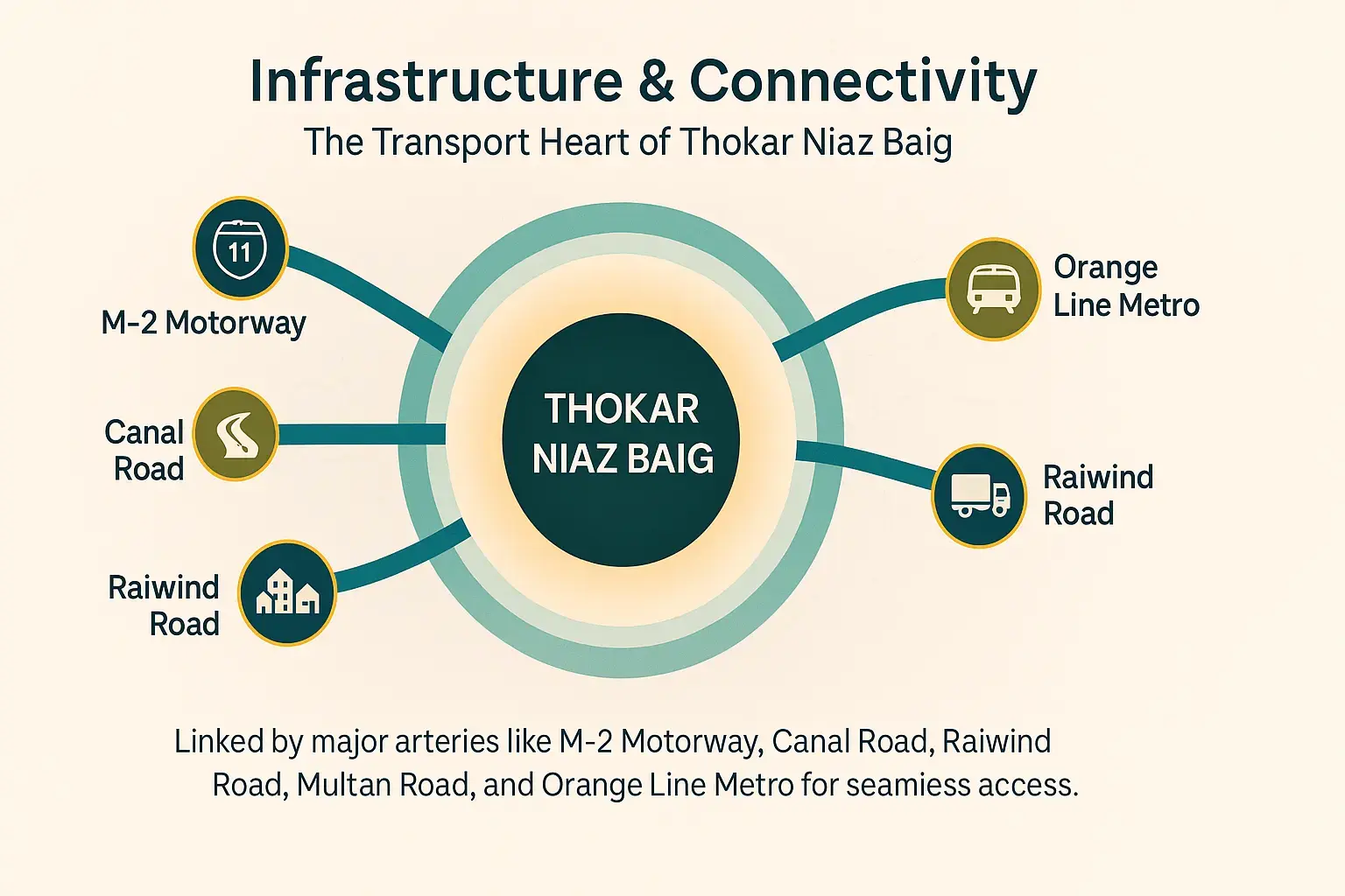 Thokar Niaz Baig is one of the most strategically linked areas of Lahore, which shares many major transport routes that propel mobility and development. It can be reached via the M-2 Motorway, which links it to the national trade routes, and Canal Road, which helps travelers to reach any part of the city quickly.