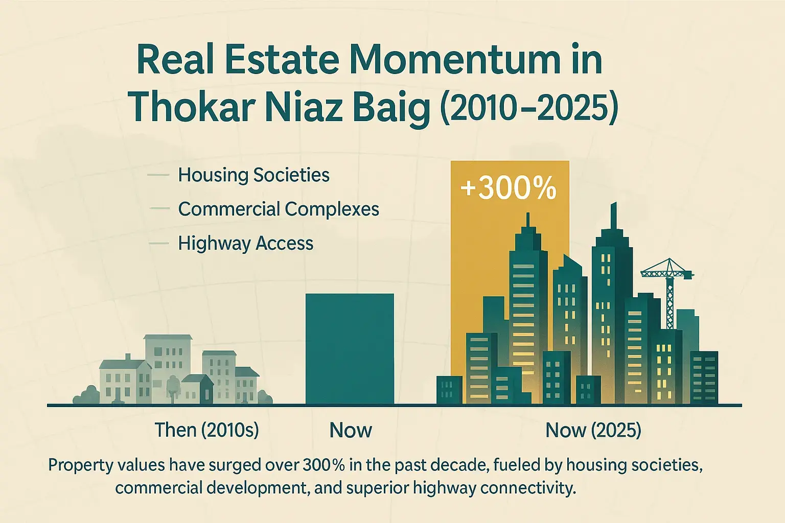 In the last 10 years, the development of real estate in Thokar Niaz Baig has witnessed an incredible rise in property rates and has grown by over 300 percent. The occurrence of modern housing societies, big commercial complexes, and the smooth connection of the area with major highways such as the M-2 Motorway and Canal Road are the factors leading to this tremendous growth. Thokar was previously a peripheral area, but today it is an ideal investment area attracting developers, investors, and residents to live in one of the most strategically located urban corridors in Lahore, both in terms of convenience and value in the long term.